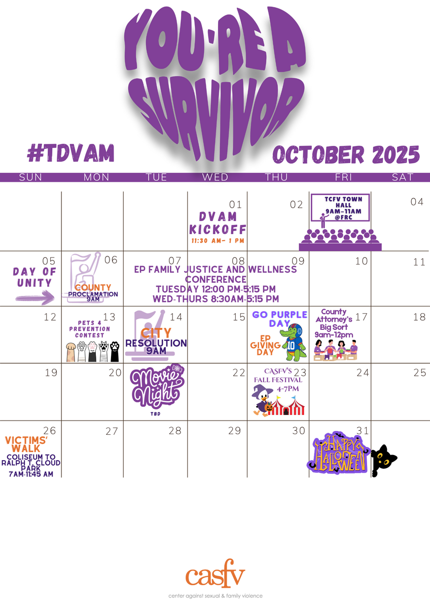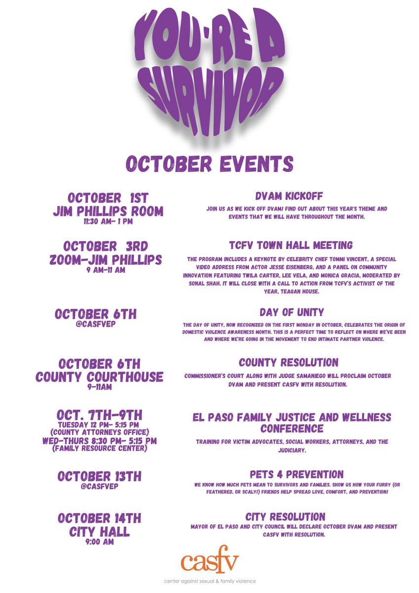 For more than 45 years, the Center Against Sexual and Family Violence (CASFV) has stood alongside survivors in the El Paso region. Our mission has always been to provide hope, healing, and empowerment through emergency shelter, advocacy, counseling, education, and community outreach. This October, we continue that mission with a renewed focus on resilience and healing.